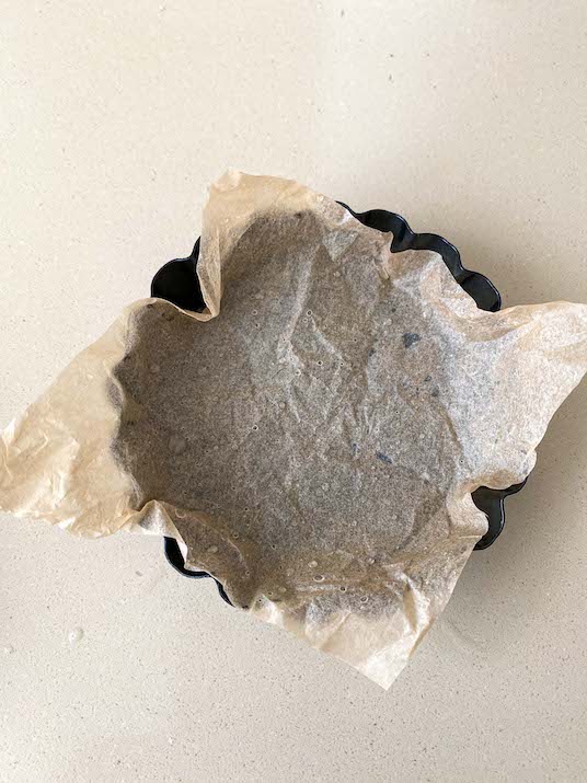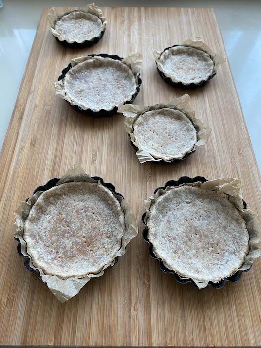 Cover the dough with plastic wrap and place it in the refrigerator for 30 minutes. Preheat the oven to 375° F / 190 ° C. In the meantime, cut 8 pieces of baking paper that fits the tartlets tins, sized 3 in / 8 cm, and 4 in/ 10 cm. Soak and squeeze the baking paper and place it inside each tin.