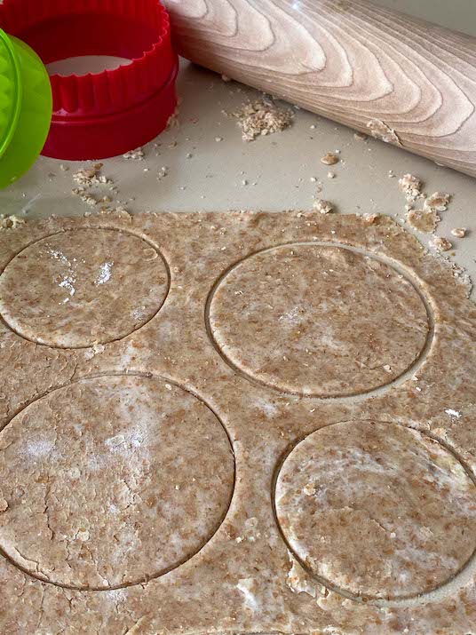 - Cover the dough with plastic wrap and place it in the refrigerator for 30 minutes. Preheat the oven to 375° F / 190 ° C. Cut 8 pieces of baking paper that fits the baking tins. Soak and squeeze the baking paper (see Notes). Place the baking paper inside each tin.