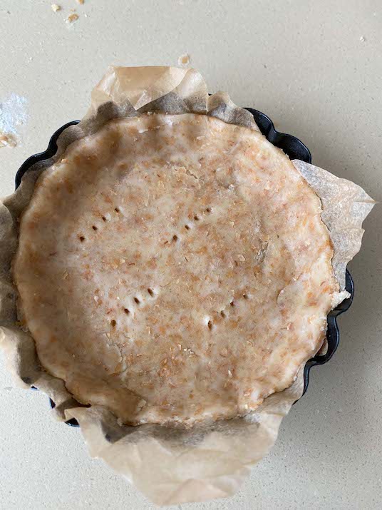 Pierce the surface with a fork. Cover the pastry with baking paper and fill it with uncooked dry beans to prevent the dough to bubble and rise while cooking. Bake it for 15 minutes then remove it and allow it to cool down. Reduce the oven to 325° F / 160 ° C.