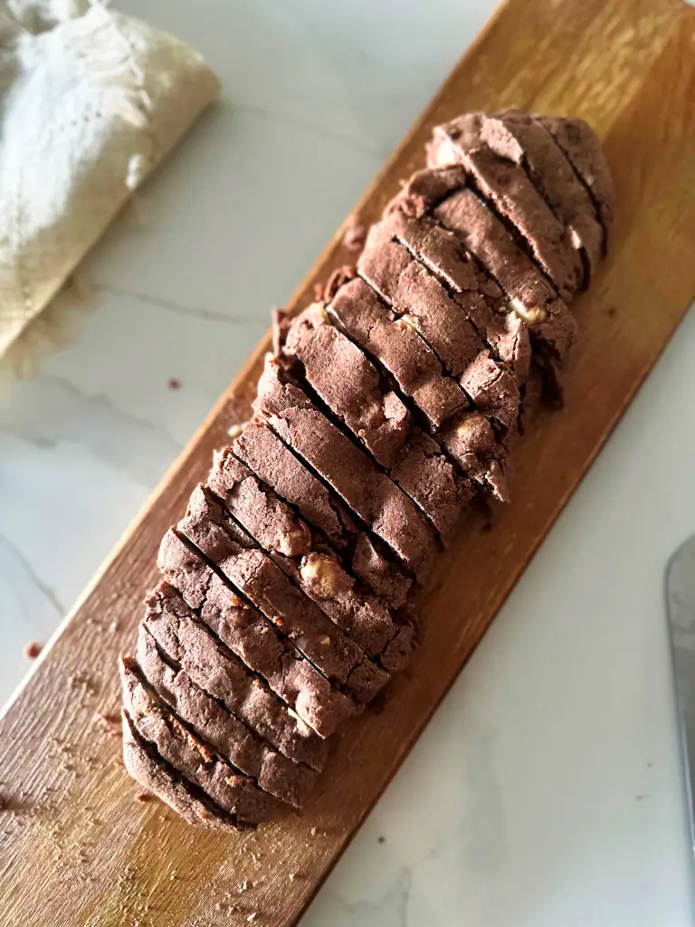– Be sure to let the baked biscotti logs cool 30 minutes before slicing. If you slice them when they are too warm, the cookies will crumble.