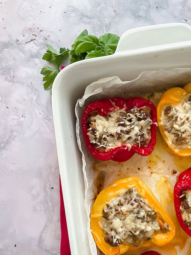 Italian Stuffed Peppers: a classic rustic dish, made with lean beef, brown rice, and bursting with classic Italian flavors such as fresh herbs, gooey mozzarella and nutty parmesan. A symphony of flavor perfect for lunch along with a side little green salad.