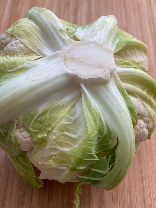 - Turn your cauliflower upside down and, with a sharp knife, remove the core by doing a circular and conic incision (see notes). The leaves should come out easily and you can roast them along with the florets.