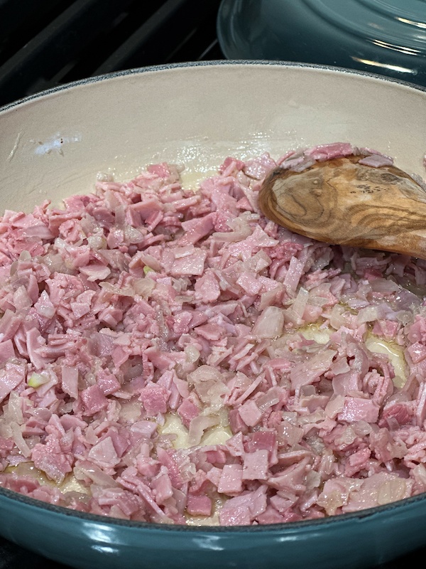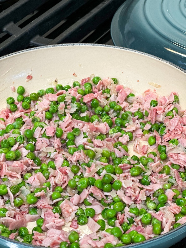 - Add 4 tablespoon of butter on a pan over medium heat. Once the butter has melted add the shallots, finely chopped. Once the shallots have become translucent add all the prosciutto. Let is cook for a few minutes then add the peas.