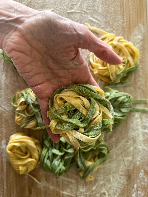 Let the fettuccine rest for at least 30-45 minutes, before cooking them. Now you can leave them flat, lay them on a rack or alternatively make cute nests like I did below.