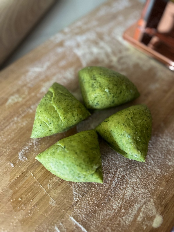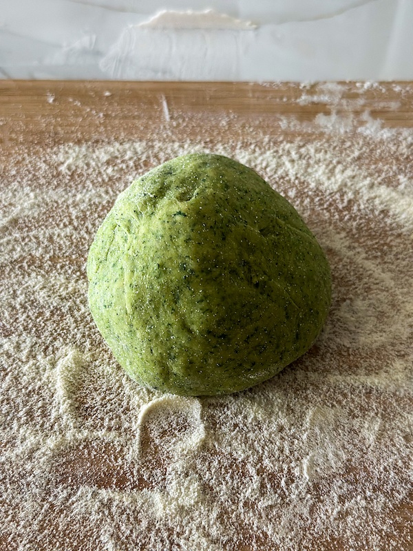 The procedure is very similar. You need first to prepare the spinach. If you use fresh spinach blanch them for 45 seconds in hot boiling water and then drain them over ice. Squeeze them well, removing any excess of water. Place the spinach and the eggs in an immersion blender and blend until combined. Add the spinach-egg mixture to the middle of the second volcano., whisking them with a fork. Incorporate the flour as you whisk. Cover it in a plastic wrap and place it in the refrigerator for 30 minutes.