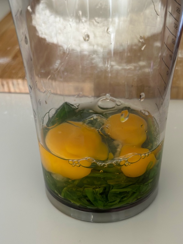 - Squeeze them well, removing any excess of water. Place the spinach and the eggs in an immersion blender and blend until combined. Add the spinach-egg mixture to the middle of the second volcano., whisking them with a fork. Incorporate the flour as you whisk.